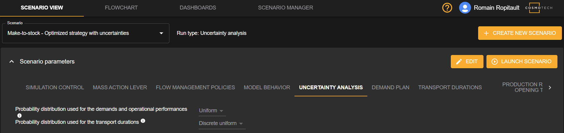 The run type Uncertainty analysis, already introduced in previous releases, has been completed with the possibility to integrate uncertainty of transport lead-times. The user can thus simulate the fact that they do not know exactly what the transport duration will be (for every transport or only some). In that case, the solution will automatically launch thousands of simulations including hazard on transport durations. This hazard is qualified by the user when configuring their scenario (distribution laws and parameters). As a result, they will get statistical results for all generated KPIs to know the confidence index to reach a certain level of performance.