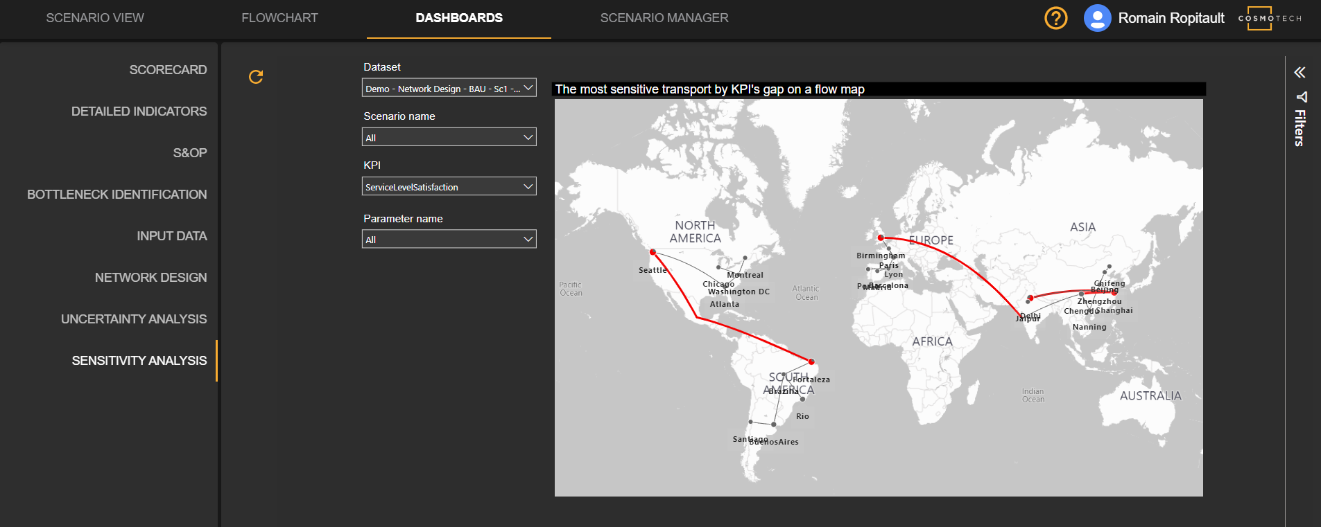 The sensitivity analysis is the study of how uncertainty in the output of a model can be divided and allocated to different sources of uncertainty in its inputs. Applied to the Simulation Digital Twin Supply Chain, this analysis allows to quantity the sensitivity of each input regarding the model’s KPIs. For instance, one can use it to identify the most impactful resources and business parameters. Or, by using it as an automated stress test of the complete supply chain, it can help in identifying where the vulnerabilities are in the case of an unexpected event.